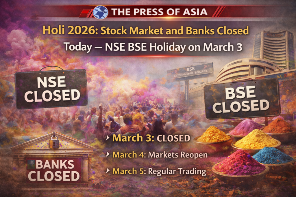 In observance of Holi 2026, the Bombay Stock Exchange (BSE) and National Stock Exchange (NSE) remain closed on Tuesday, March 3, 2026. The Multi Commodity Exchange (MCX) is also shut for regular trading today, though it will conduct an evening session as per its standard holiday protocol.