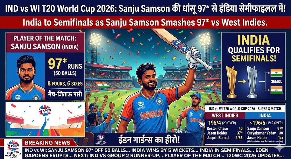 कोलकाता, 2 मार्च 2026: आईसीसी टी20 विश्व कप 2026 के एक बेहद रोमांचक ‘करो या मरो’ वाले मुकाबले में भारत ने वेस्टइंडीज को 5 विकेट से हराकर सेमीफाइनल में अपनी जगह पक्की कर ली है। कोलकाता के ऐतिहासिक ईडन गार्डन्स मैदान पर रविवार, 1 मार्च 2026 को खेले गए इस सुपर 8 मैच में संजू सैमसन ने अपने करियर की अब तक की सबसे यादगार पारी खेली। सैमसन ने महज 50 गेंदों पर नाबाद 97 रन बनाकर भारत को एक असंभव से दिख रहे लक्ष्य तक पहुंचा दिया।