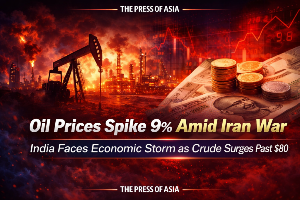 Global crude oil prices surged by up to 9 percent as the US-Israel war on Iran entered its fifth day, triggering fears of a prolonged energy crisis. Brent crude hit the upper $79-80 range after tanker traffic through the critical Strait of Hormuz was effectively halted.