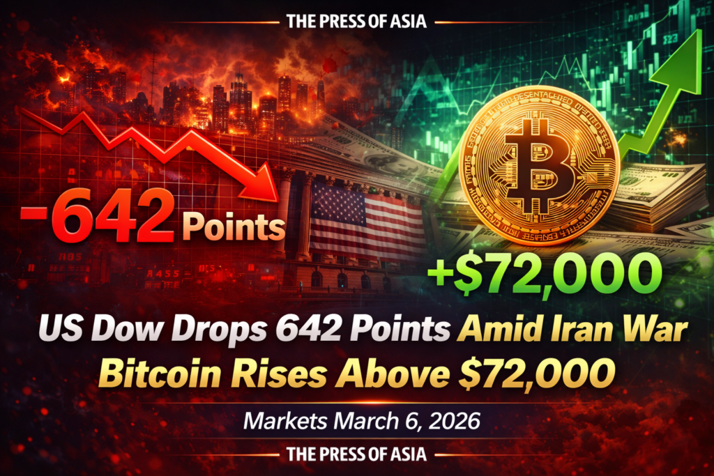 Global financial markets showed a mixed picture on March 6, 2026, as investors grappled with the contradictory signals from the ongoing US-Iran War. The Dow Jones Industrial Average fell 642 points, while the Nasdaq Composite surged, and Bitcoin climbed above the $72,000 mark for the first time in weeks.